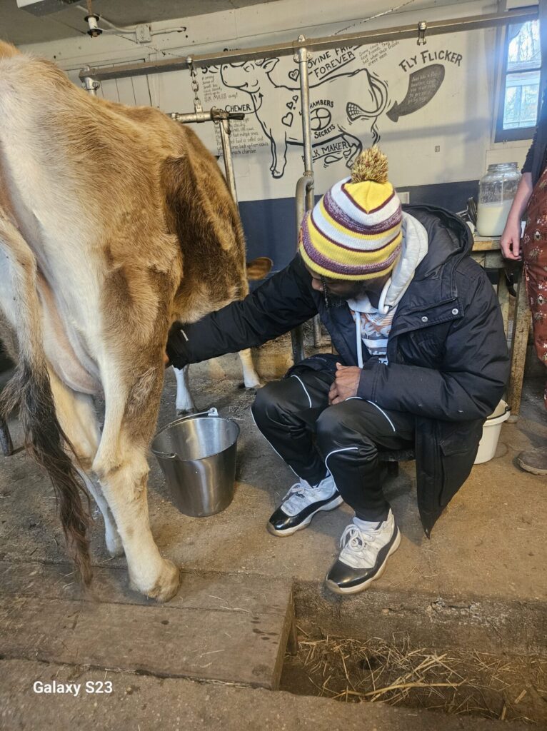 Lesley’s favorite memory of his visits to Hard Bargain Farm is milking a cow, an activity he was afraid to do when he was younger. School groups who stay overnight at the Alice Ferguson Foundation’s environmental campus help with the morning farm chores of milking the dairy cow, Opal, while learning about the milking process.